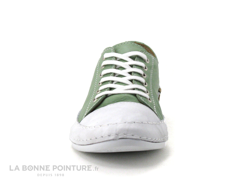 Cette basket basse Femme Andrea Conti est en cuir vert aspect froissé, avec la pointe et le pourtour en cuir blanc.