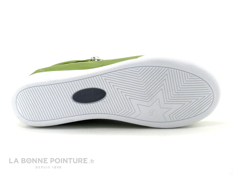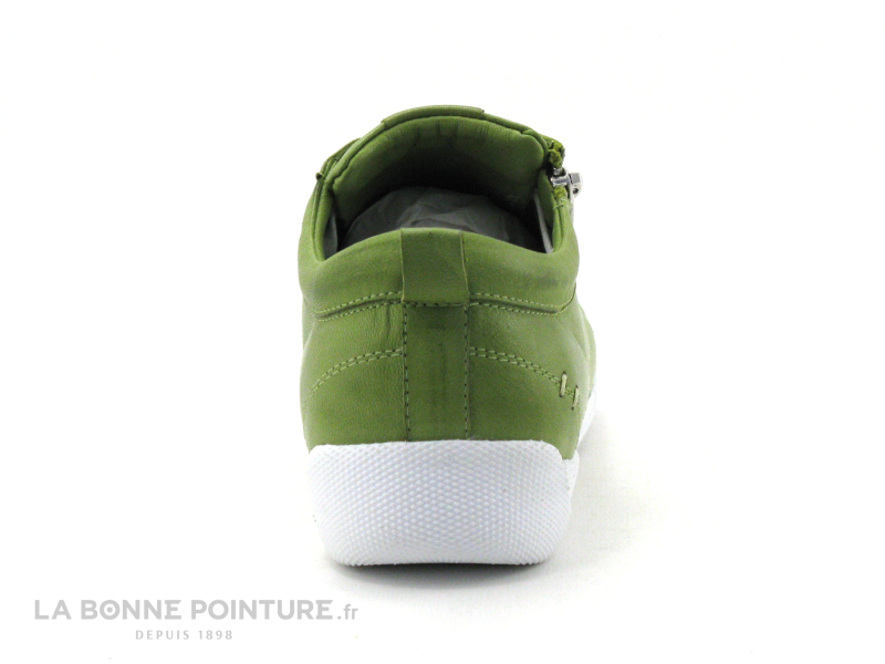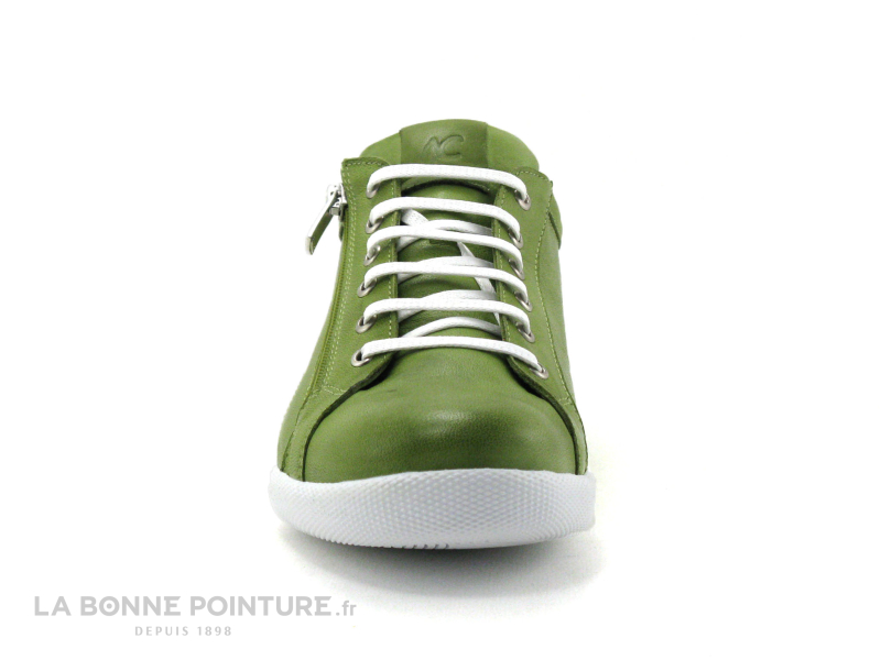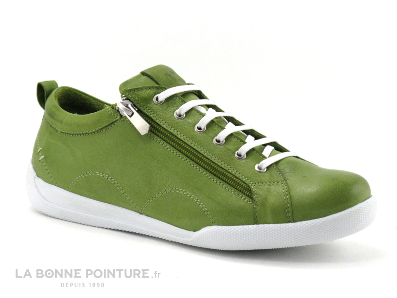 Cette basket basse Femme très souple est fabriquée avec un beau cuir vert, à l’aspect veiné et nuancé.