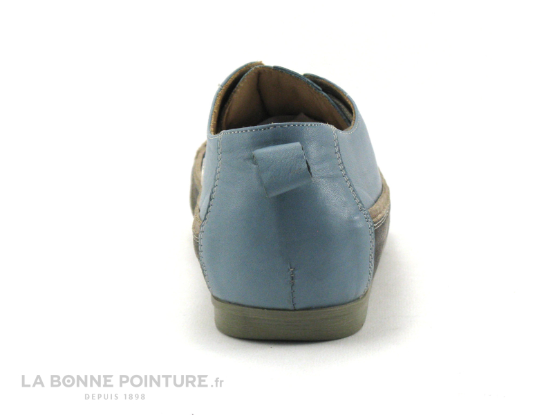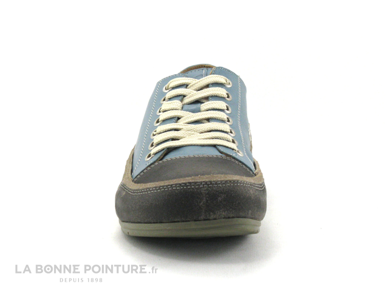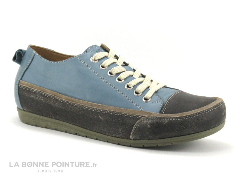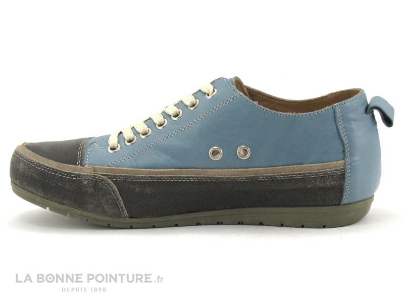 Ces sneakers mode Femme mélangent un cuir bleu pétrole très souple et un cuir velours marron foncé, à l’aspect “used”/ gratté.