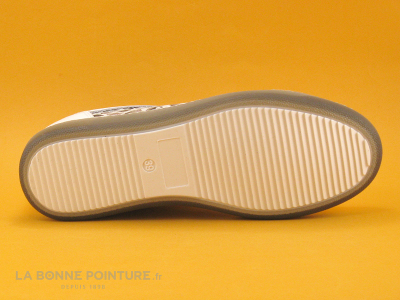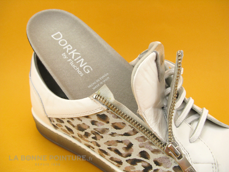 Cette basket Femme Dorking by Fluchos mélange un beau cuir blanc et un cuir imprimé léopard aux reflets métallisés.