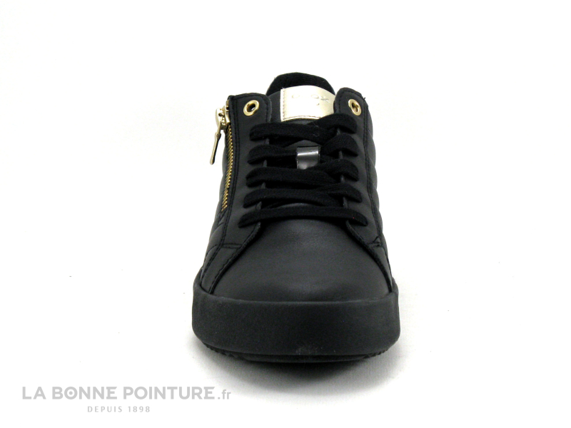Fermeture facile des tennis noires Geox Blomiee avec la fermeture éclair dorée sur le côté.