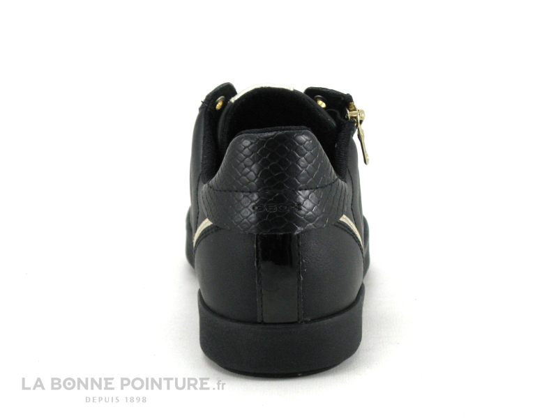 Cette basket basse Femme Geox est en simili cuir noir, avec une partie aspect reptile Ă l’arrière et un peu de dorĂ©.