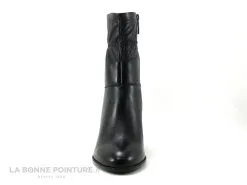 Cette bottine Femme à pointe arrondie est en cuir noir, composée d’empiècement lisses et plus ou moins grainés.
