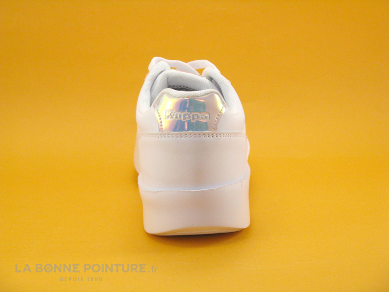 Cette basket mode Kappa Femme est blanc mat, avec des parties métallisées à l’arrière et sur la languette marquées Kappa.