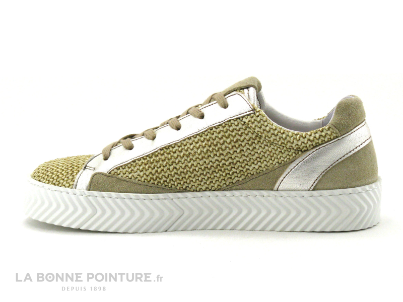 Cette basket mode La Vie est Belle Fidji se démarque avec son aspect naturel paille tressée, associé à un cuir velours beige et à un cuir lisse argenté.