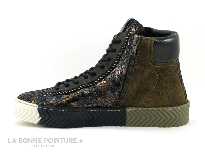 Ces superbes baskets montantes Femme La Vie est Belle Fusain mélangent des parties de cuir bronze métallisé aspect cobra, marron velours et noir verni, pour un maximum d’allure !