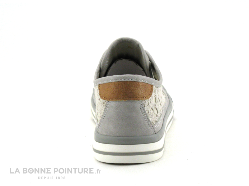 Cette tennis Femme est en simili cuir gris, avec du marron camel sur la languette et Ă l’arrière de la chaussure.