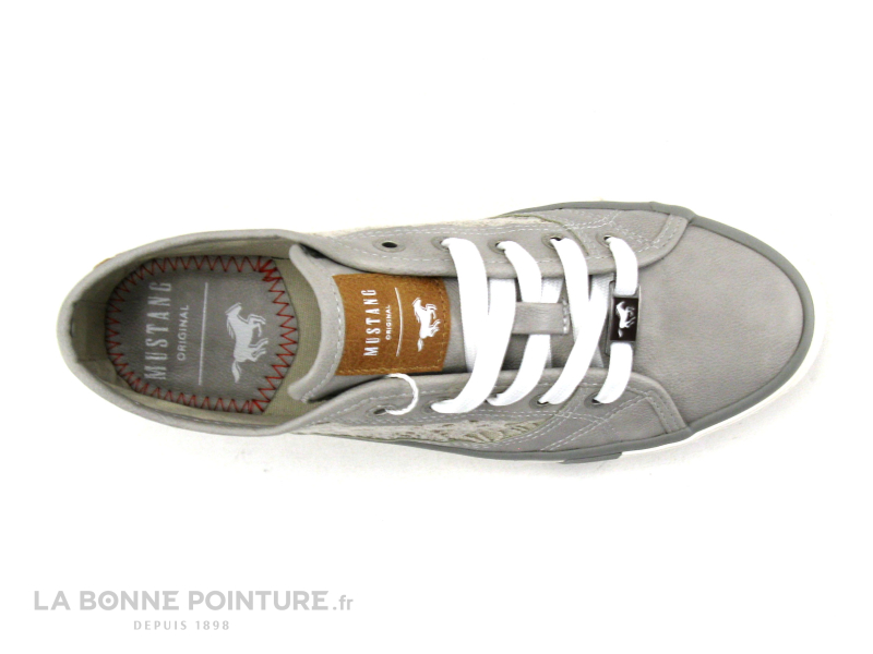 Vous fermerez vos tennis grises avec le lacet plat blanc, qui traverse 5 oeillets et une petite plaque métallique avec le cheval logo Mustang.