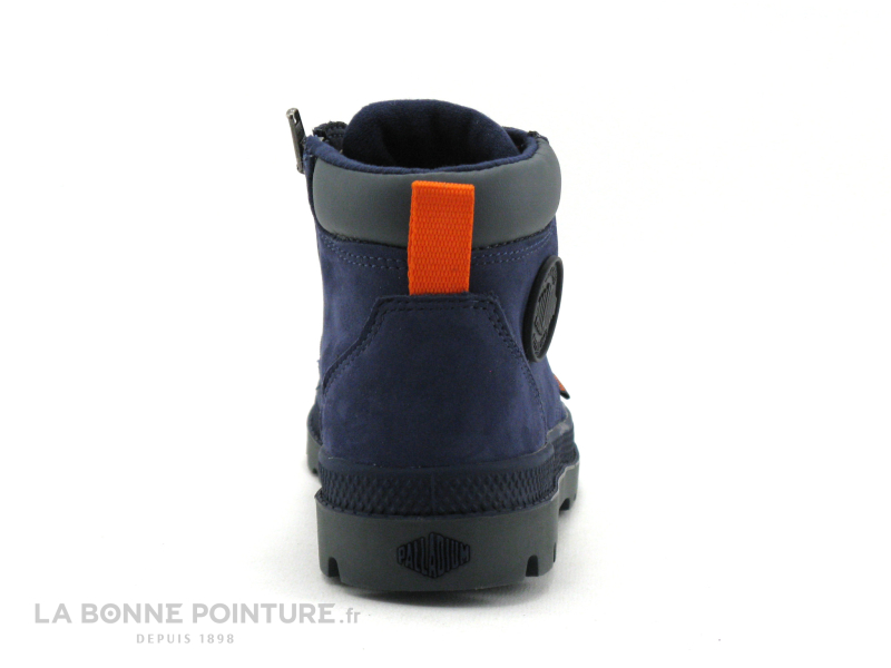Cette chaussure montante Palladium Pampa est principalement en cuir velours bleu marine, avec une languette orange à l’arrière associée à une étiquette sur le haut marquée Palladium Waterproof.