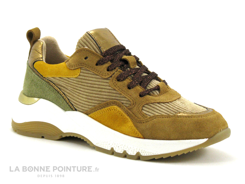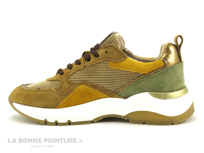 Cette basket basse Femme Pretty Love est en cuir velours et textile, aux tons de beige, de camel, de kaki et de doré.