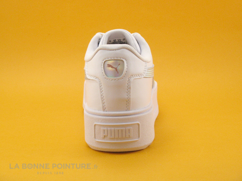 Cette basket Femme à semelle épaisse Puma Karmen est blanche, avec des courbes argent sur les côtés et la marque Puma en rose gold.