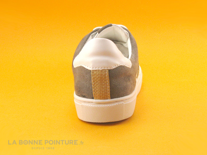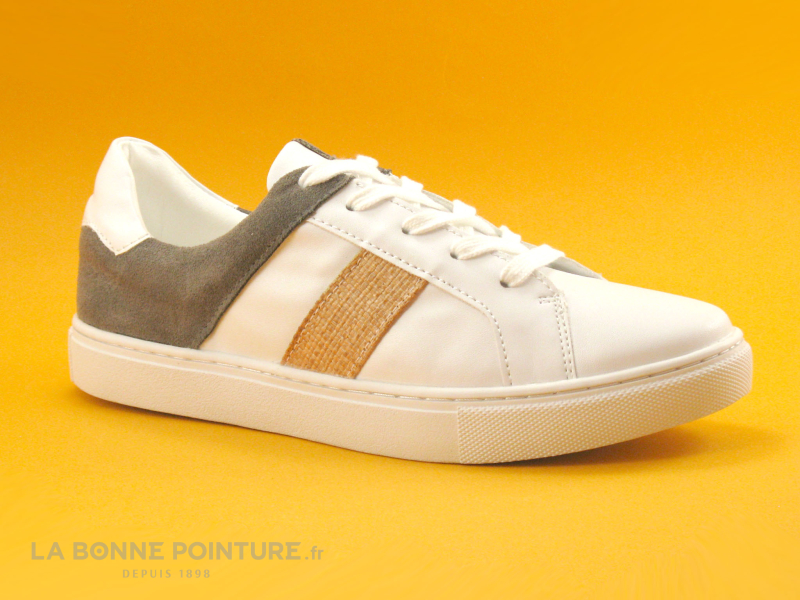 Cette basket basse Femme est en simili cuir blanc, habillée de marron velouté et de bandes effet raphia qui caractérisent la chaussure.